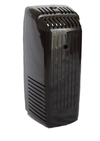 Es un aparato odorizador de 10x10x23 cm que contiene dentro una lata con líquido desodorante y aromatizante y un pequeño ventilador que trabaja con una pila convencional tipo “D” de 1.5 volts.